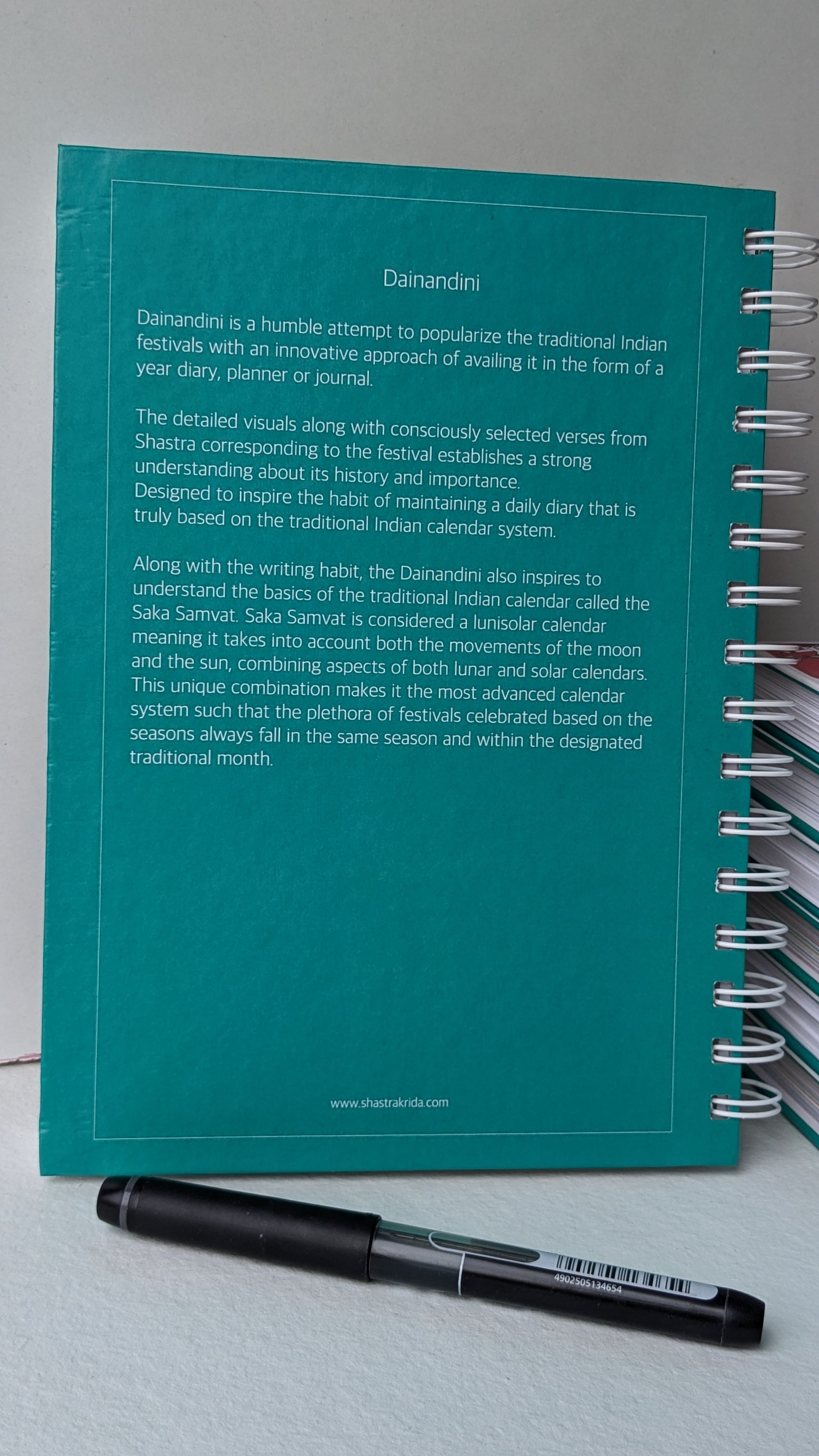 Truly one of a kind, Dainandini is designed around the colourful festivals (Utsav) of Bharat. Fulfilling the very need of a Year Diary or Planner which is based on Bharatiya Calendar System (Chaitra to Falguni). Interactive design with consciously selected relevant verses from Shastra and English translation to inspire further reading curiosity.